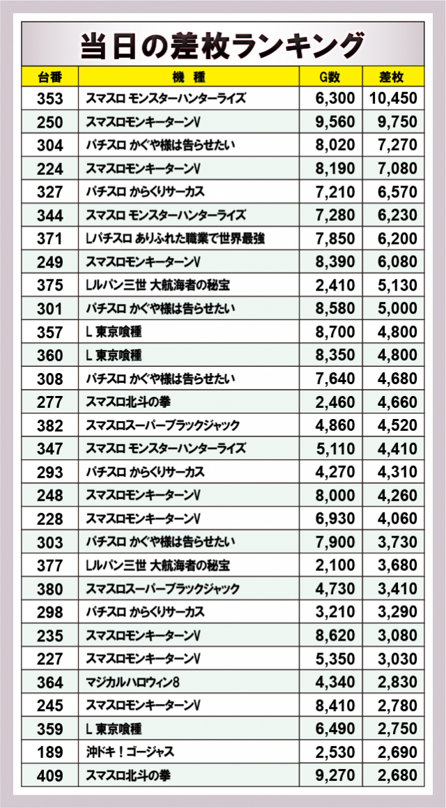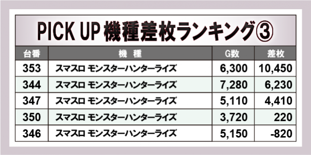 『スマスロ モンスターハンターライズ』から万枚OVER達成台が生まれ、そのポテンシャルを存分に発揮していた。次いで『スマスロモンキーターンV』も9,000枚OVERと追随しており、全体的にまとまった出玉を確保する台が多かったのが鮮烈だ。閉店までじっくりと打ち込まれた形跡も相まって、ファンは有意義な時間を過ごしていたことだろう。