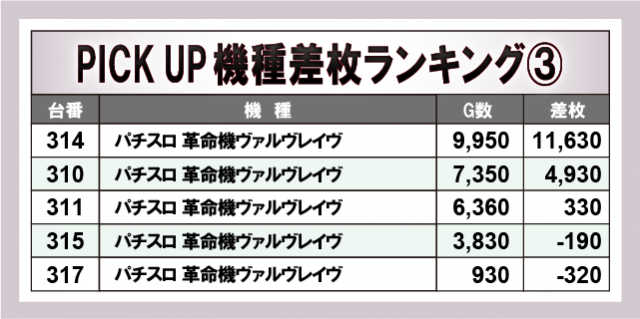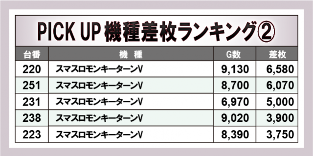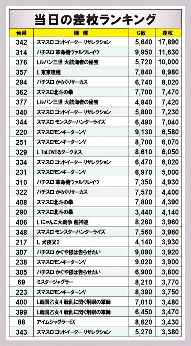 上表の5機種をみると、ファンが自信をもってレバーを叩いていた様子が目に浮かぶ。万枚OVER台が発生した『スマスロ ゴッドイーター リザレクション』『パチスロ 革命機ヴァルヴレイヴ』はもちろん、『スマスロモンキーターンV』も大台突破台が数多く確認でき、実力を持った人気機種が気を吐いた印象だ。もちろん『マイジャグラーⅤ』『アイムジャグラーEX』も例に漏れず、特に後者は3,000枚OVERが2台と大きな熱を帯びていたのも見逃せない。