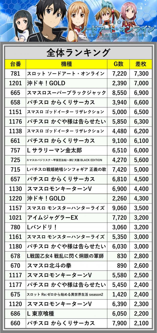 厳選された取材対象機種をはじめ、その他スロット全体から好記録が飛び出した!プレイヤーが楽しんだ1日を下記データにて振り返ってみて欲しい。