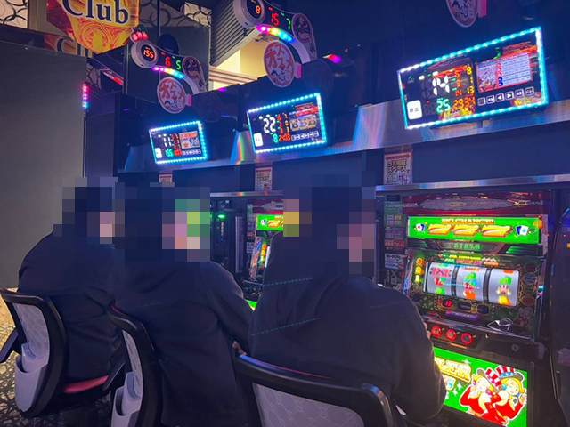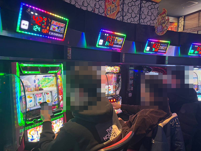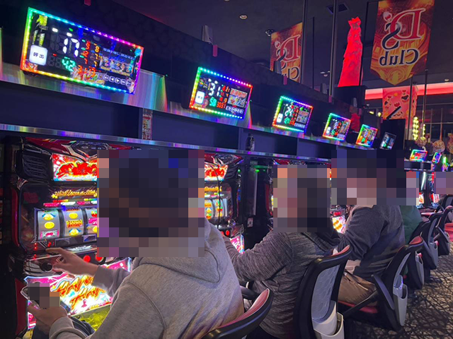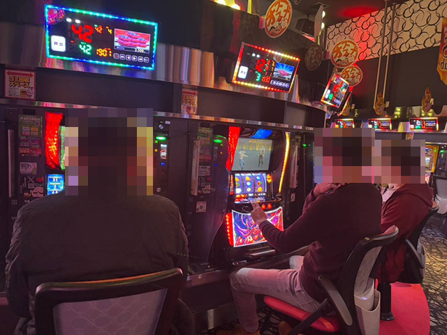 パチスロコーナーをみてみると、さまざまな機種にプレイヤーたちの笑顔が並んでいた。