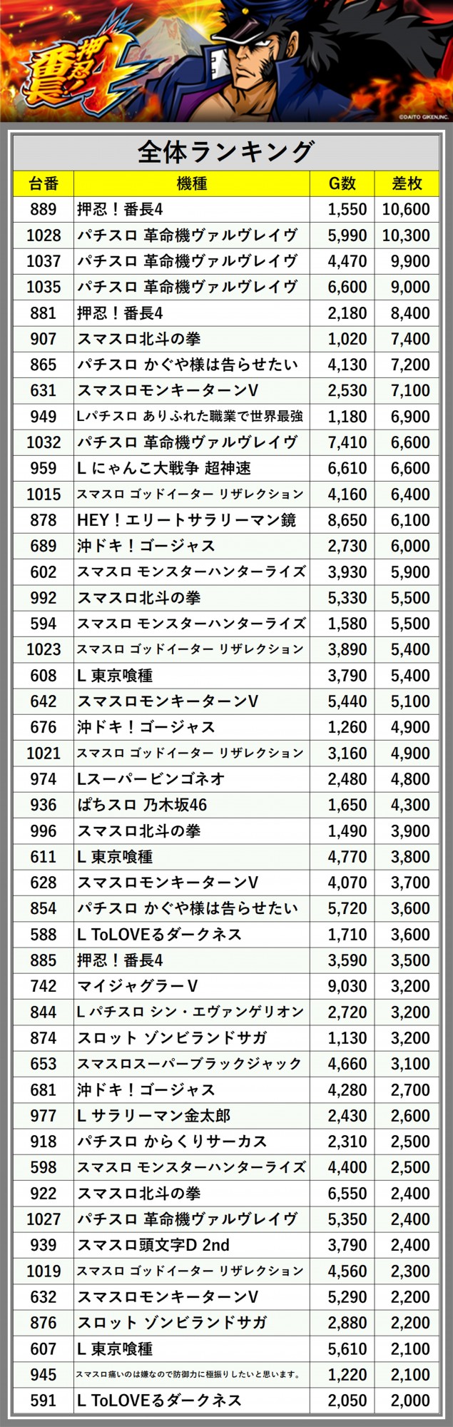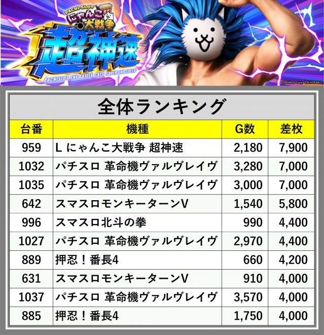 厳選された取材対象機種をはじめ、その他スロット全体から好記録が飛び出した!プレイヤーが楽しんだ1日を下記データにて振り返ってみて欲しい。