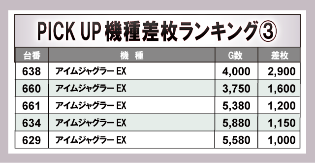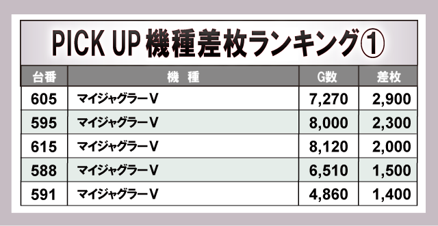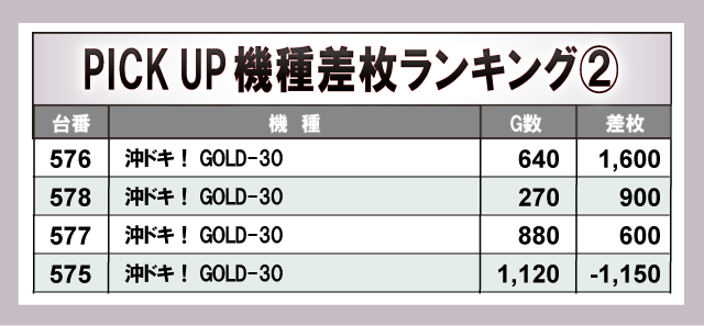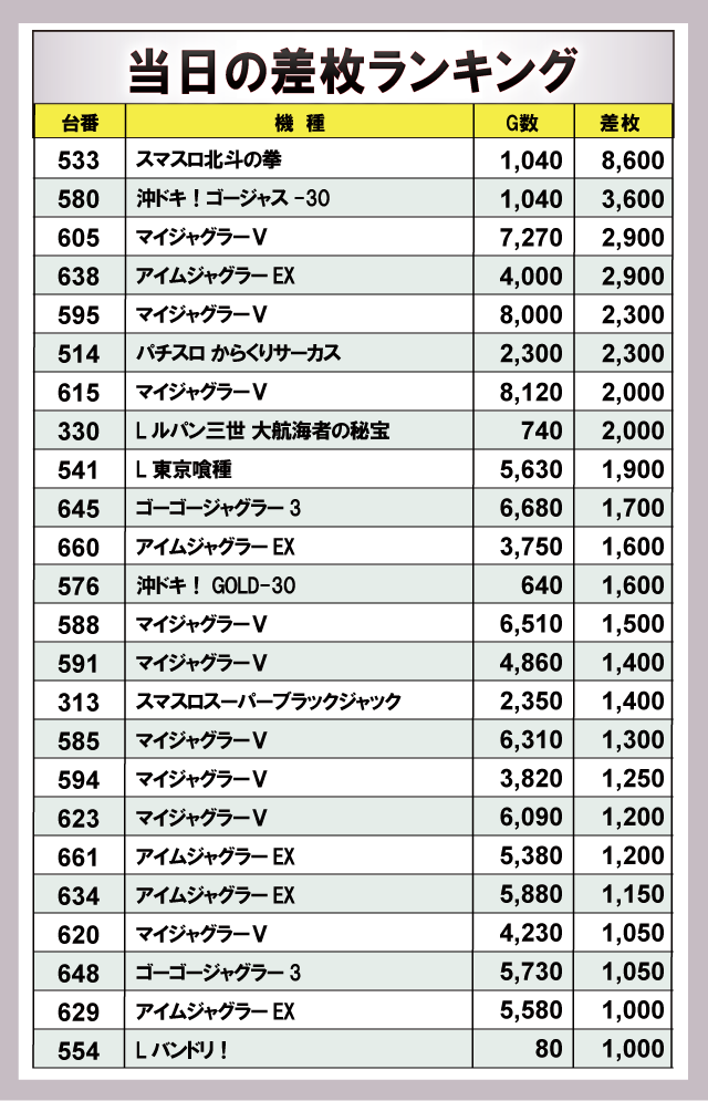 『スマスロ北斗の拳』から+8,000枚OVERが発生しており、店内の盛り上がりをリードする存在となっていた。そして上表を見ての通り『沖ドキ』シリーズや『ジャグラー』シリーズがランキングの大半を占めており、遊技するファンは相当な手応えを掴んでいたことだろう。