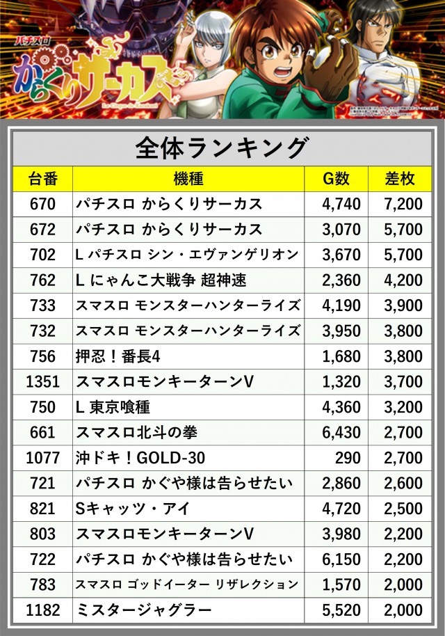 厳選された取材対象機種をはじめ、その他スロット全体から好記録が飛び出した!プレイヤーが楽しんだ1日を下記データにて振り返ってみて欲しい。