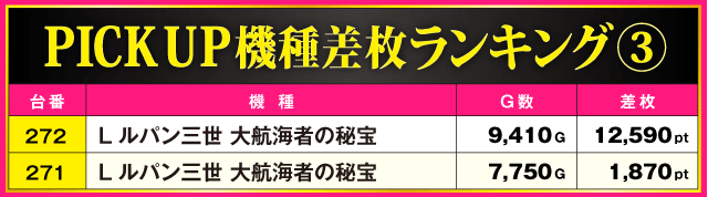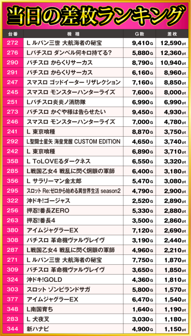 この日は、ランキングベスト3が全て万枚超を達成する盛況ぶりを見せていた。そんな中、『Lルパン三世 大航海者の秘宝』が+12,590ptを記録しトップに。次いで『Lパチスロ ダンベル何キロ持てる?』が僅差の+12,360ptで2位にランクインする実にハイレベルな結果を残している。