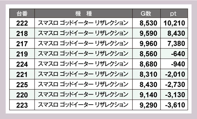 『スマスロ ゴッドイーター リザレクション』は222番台+10,210pt、218番台+8,430pt、217番台+7,380ptなど、多くの台が見事なパフォーマンスを披露している。
