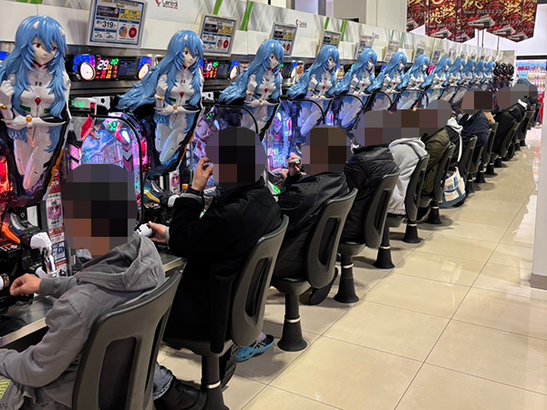 12時ごろの4円パチンコを見てみると「新世紀エヴァンゲリオン〜未来への咆哮〜」や「ぱちんこ シン・エヴァンゲリオン Type レイ」が活況。プレイヤーの満足そうな表情から、充実した時間を過ごしていたことがうかがえる。