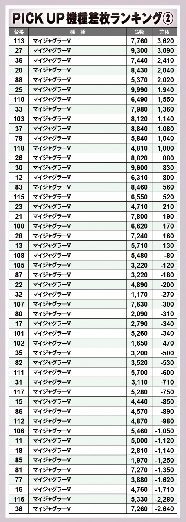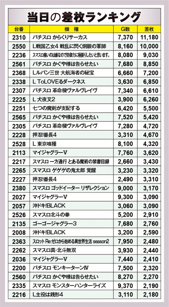 ※差枚数順に掲載しています。
