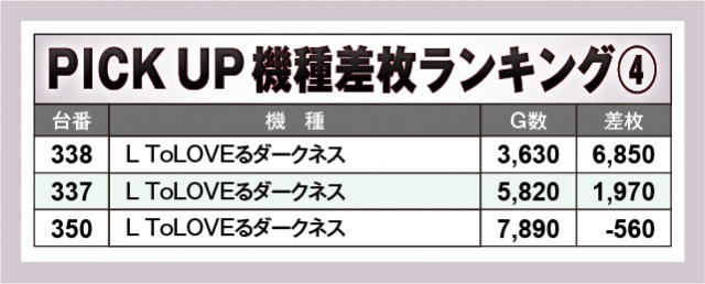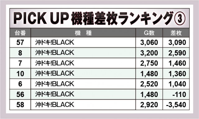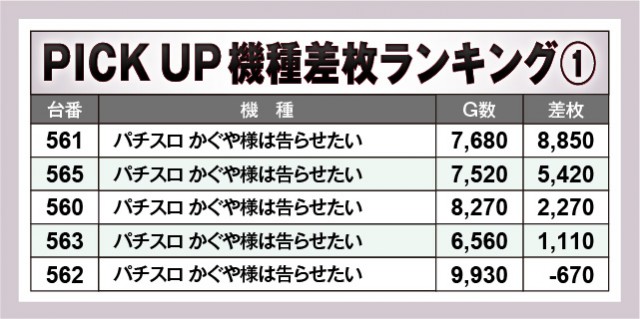 『パチスロ かぐや様は告らせたい』は全台が終日を通して打ち込まれており、惜しくも全台プラス差枚数という大記録を逃している。しかしその熱量は十分で、8,000枚OVERとインパクトを残すことに成功。『沖ドキ!BLACK』『L ToLOVEるダークネス』も同様にポテンシャルを解き放ち、大量設置された『マイジャグラーⅤ』もコンスタントに大当りを射止めるなど、優秀機種の賑わいが目立った内容となっている。
