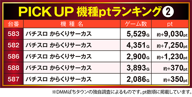 「パチスロ からくりサーカス」では、583番台が約+9,030ptを記録。