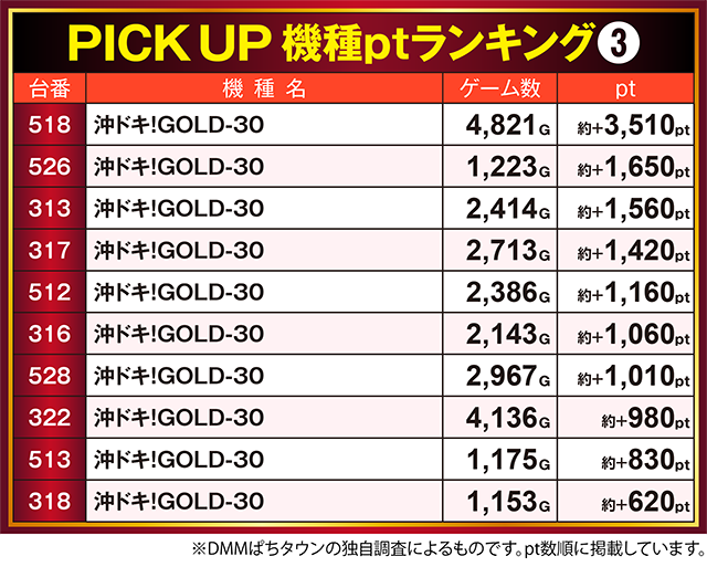 「沖ドキ!GOLD-30」もにぎわいが大きく、7台が約+1,000ptオーバー。