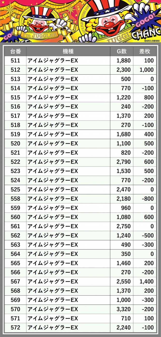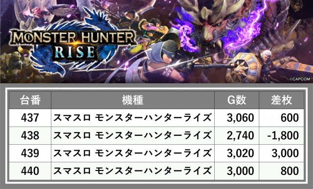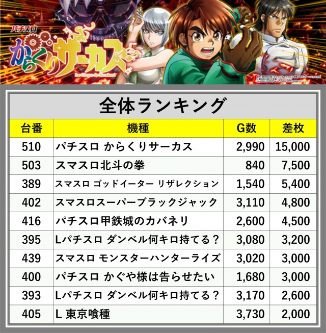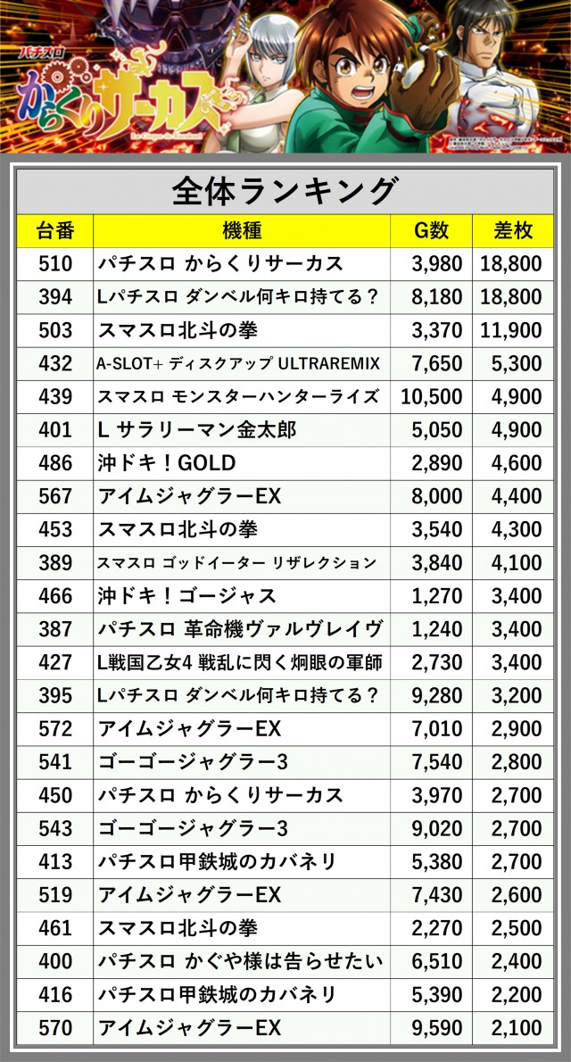 厳選された取材対象機種をはじめ、その他スロット全体から好記録が飛び出した!プレイヤーが楽しんだ1日を下記データにて振り返ってみて欲しい。