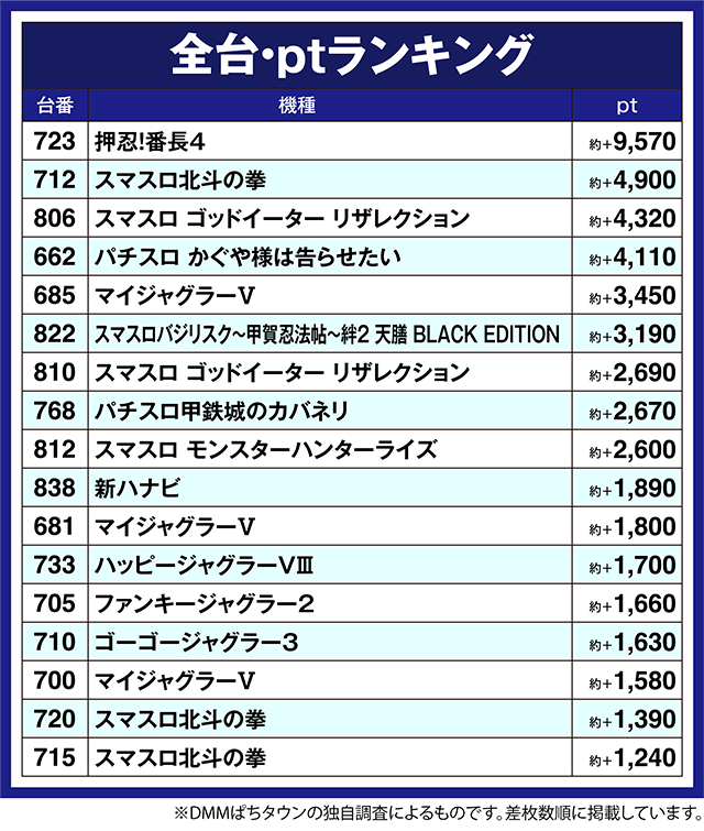 ほかにも、768番台の「パチスロ甲鉄城のカバネリ」が約+2,670pt、838番台の「新ハナビ」が約+1,890ptを記録した。