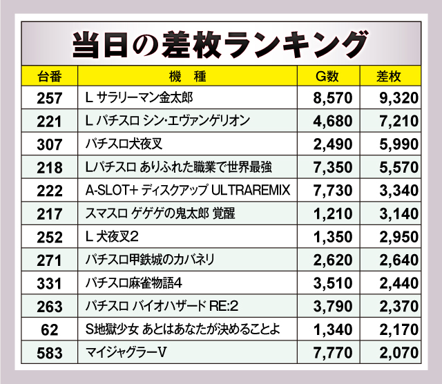 当日の差枚ランキングを見てみると、12台のうち6台が差枚+3,000枚オーバーで、それらのなかでもっとも優秀だった台は、257番台の「L サラリーマン金太郎」で、差枚は+9,320枚を獲得! またその他ランクイン機種を見渡すと、最新スマスロを筆頭に「パチスロ甲鉄城のカバネリ」や「マイジャグラーⅤ」など、さまざまな機種が多くランクイン。幅広い機種にチャンスが隠されていたようだ!
