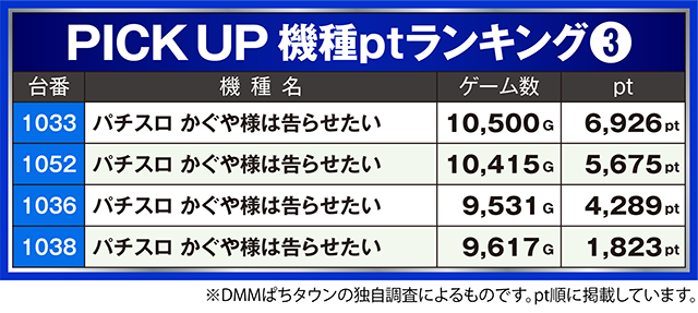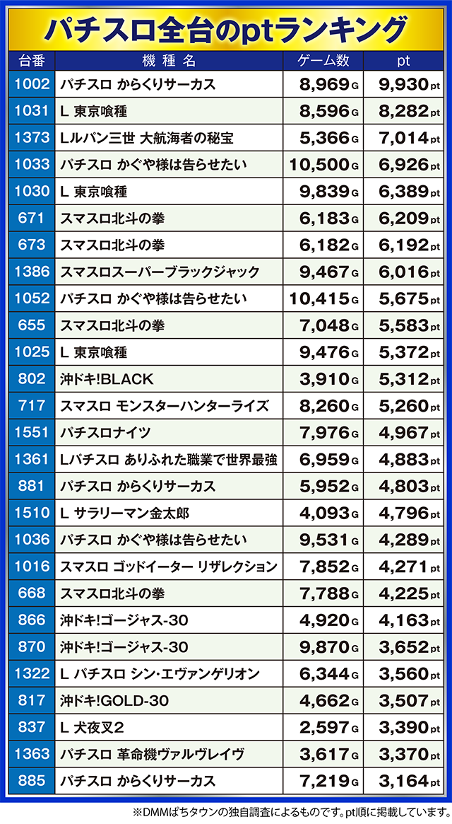 ほかにも、「パチスロ かぐや様は告らせたい」や「スマスロ北斗の拳」などに6,000ptを超えた台アリ。