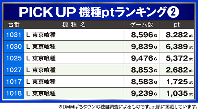 最新機種も活気は大きく、「L 東京喰種」の1031番台が8,282ptとなった。