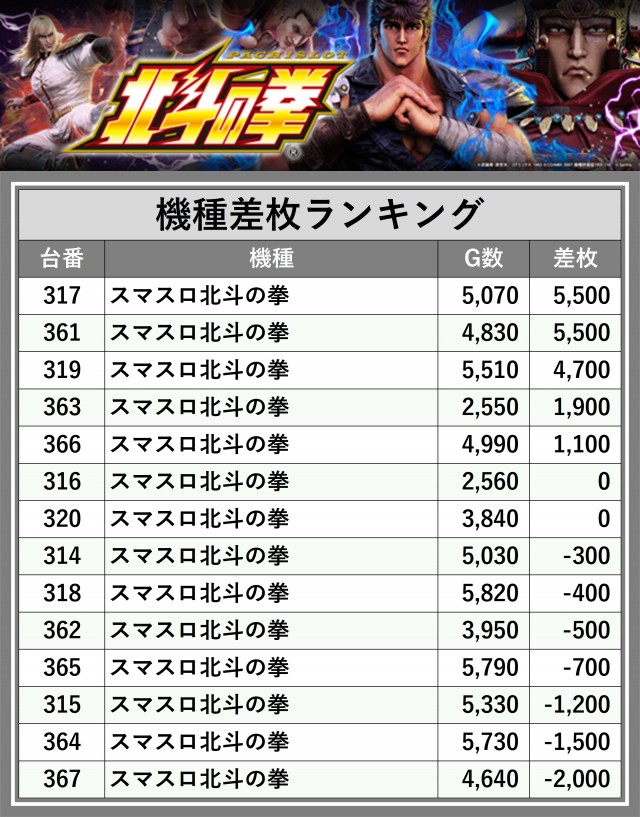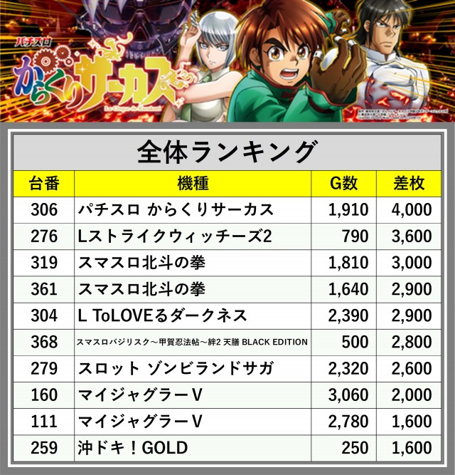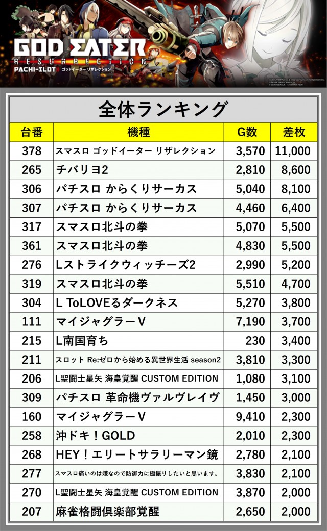 ※差枚数順に掲載しています