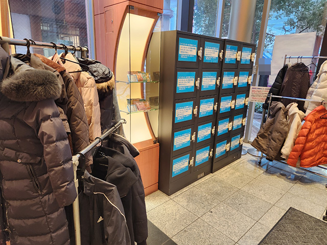 カウンターの前には、ハンガーラックやロッカーが設置されている。