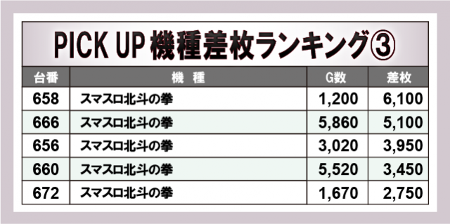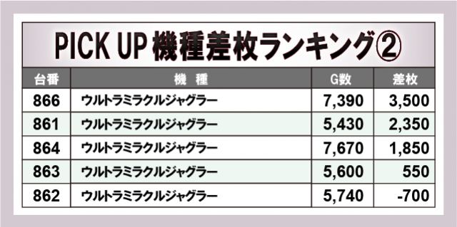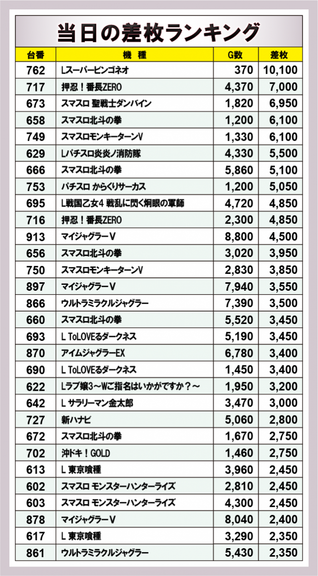 突出して目立っていたのが上表の5機種で、上述の差枚ランキング30台にランクインした機種が島全体で盛り上がりをみせていたようだ。各所で凄まじい活気と熱気に溢れており、揃って驚異的な出玉を披露したことにより、遊技していたファンは有意義な時間を過ごしていたことだろう。