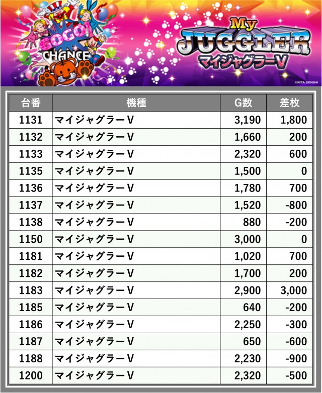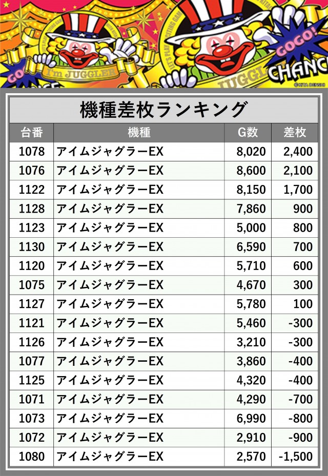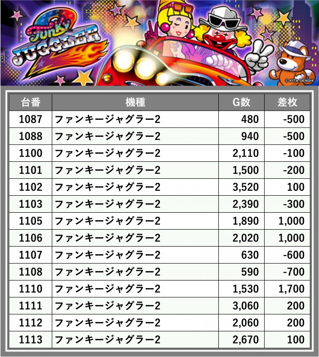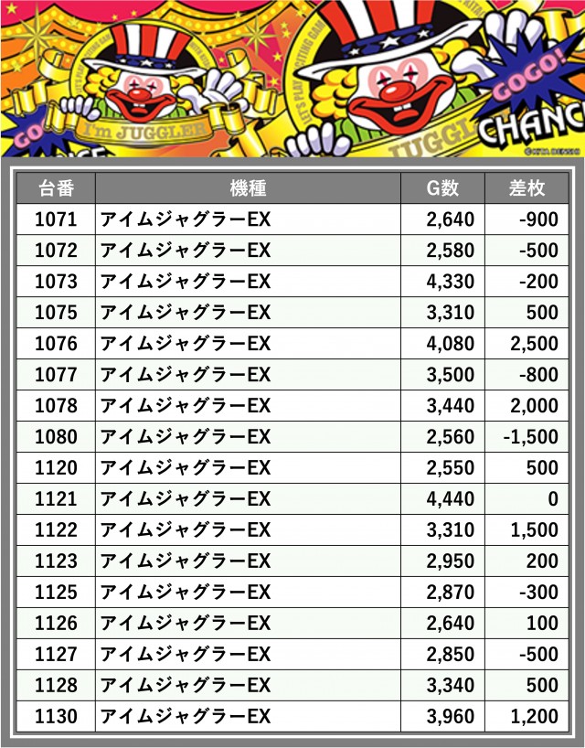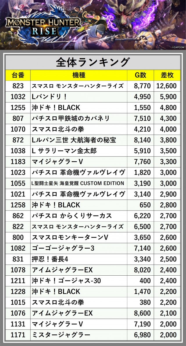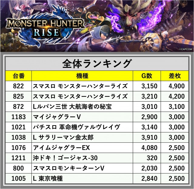 厳選された取材対象機種をはじめ、その他スロット全体から好記録が飛び出した!プレイヤーが楽しんだ1日を下記データにて振り返ってみて欲しい。