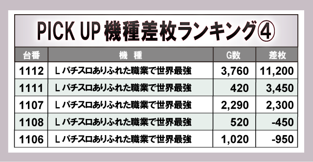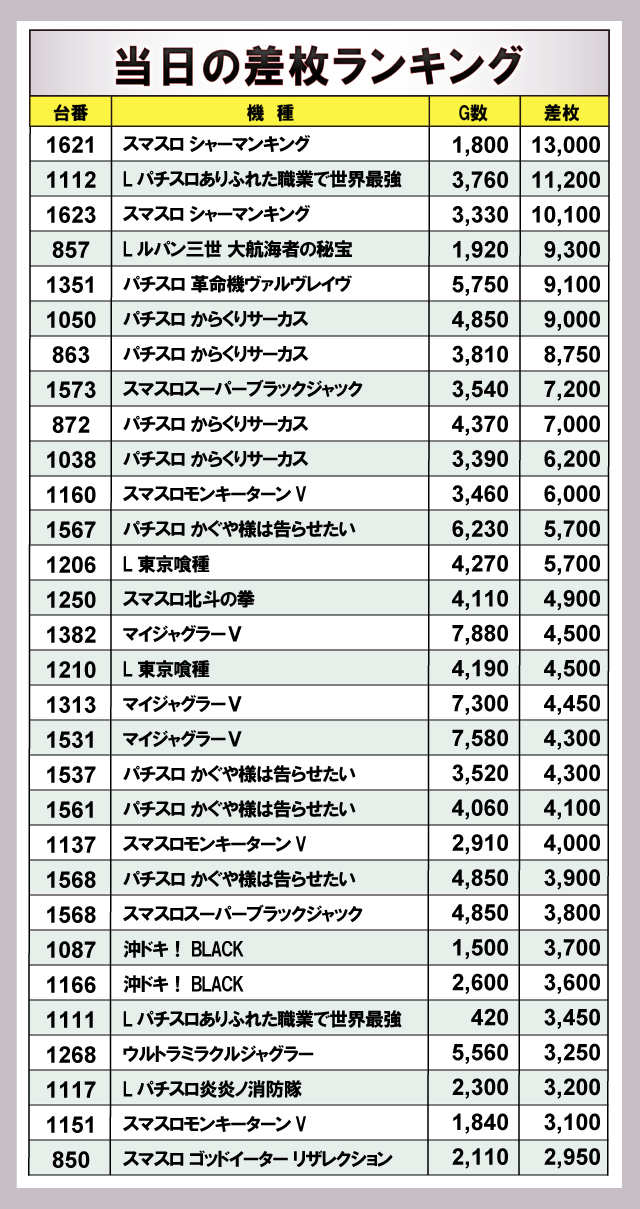 『スマスロ シャーマンキング』から+13,000枚と+10,100枚、『Lパチスロ ありふれた職業で世界最強』から+11,200枚!なんと万枚OVERが3台という驚きの結果に!また、差枚ランキングTOP30は、ほぼ全てが+3,000枚OVERという高いパフォーマンスを見せており、店内全体を通して凄まじい熱気が感じ取れる内容だ!