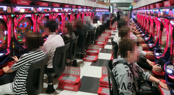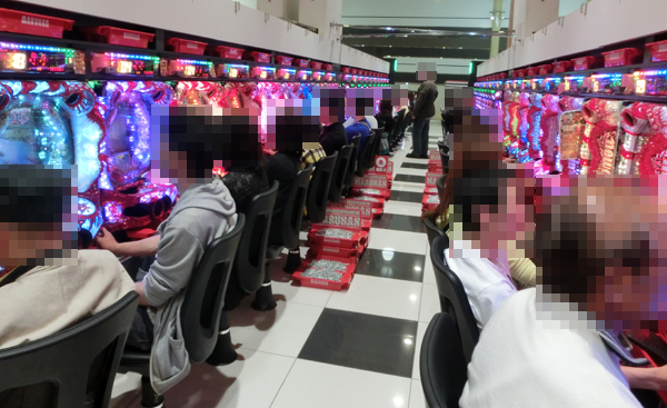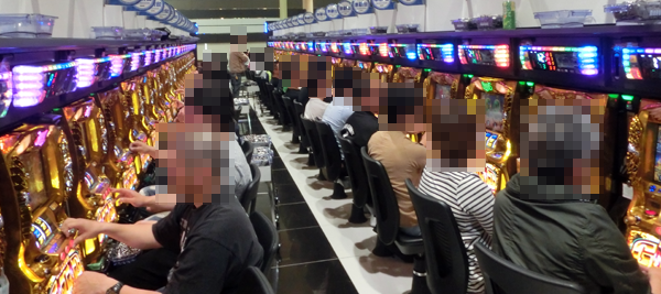 パチンコ全体の稼働率は8割以上と高く、「CR大海物語3スペシャル」は満席状態。そのほかの「海物語シリーズ」も盛況で、大当りを堪能しているプレイヤーが多く、各人の表情からもストレスなく楽しめているのがわかる。