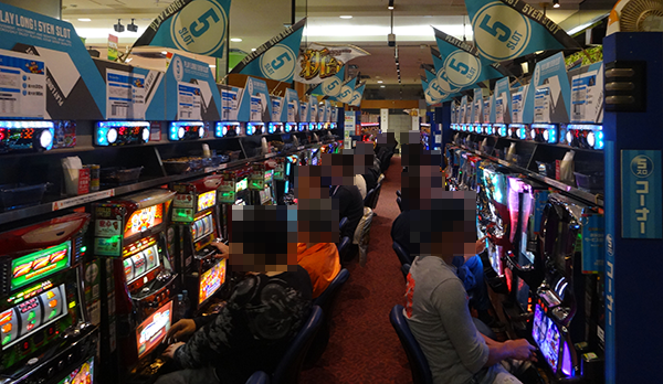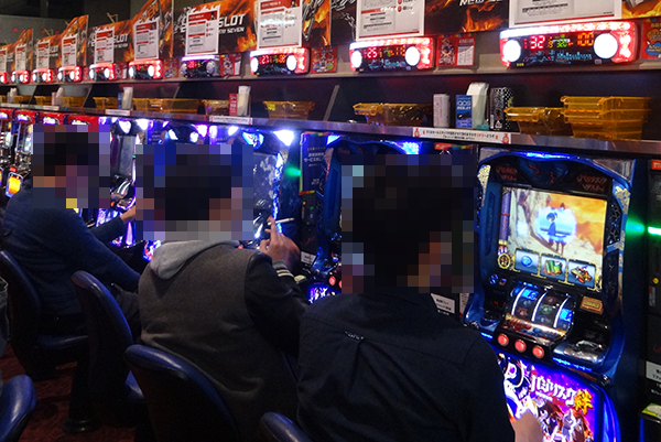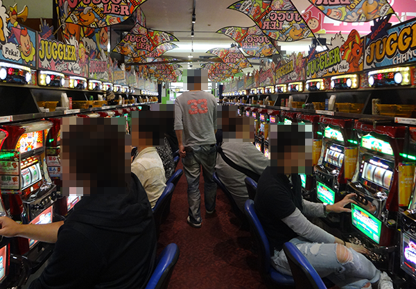 20円パチスロでは、ジャグラーシリーズが大盛況。明るい表情で遊技を楽しむプレイヤーの姿からは、充実した時間を過ごせていることがうかがえた。