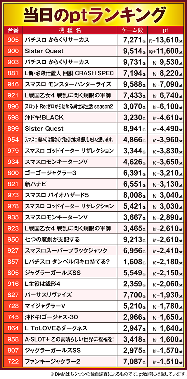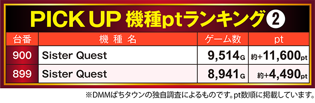 最新機種も活気が大きく、「Sister Quest」の900番台が約+11,600ptとなりました★