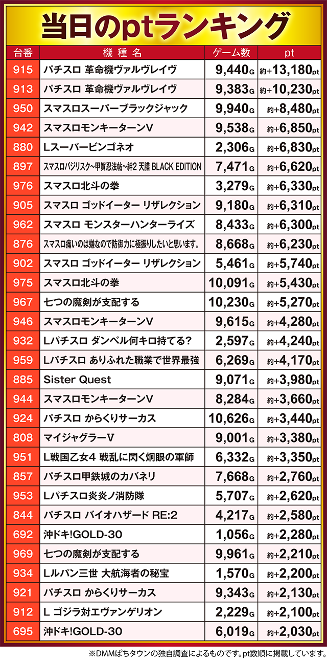 913番台も約+10,000pt超と、機種全体が大きく盛り上がっていました☆