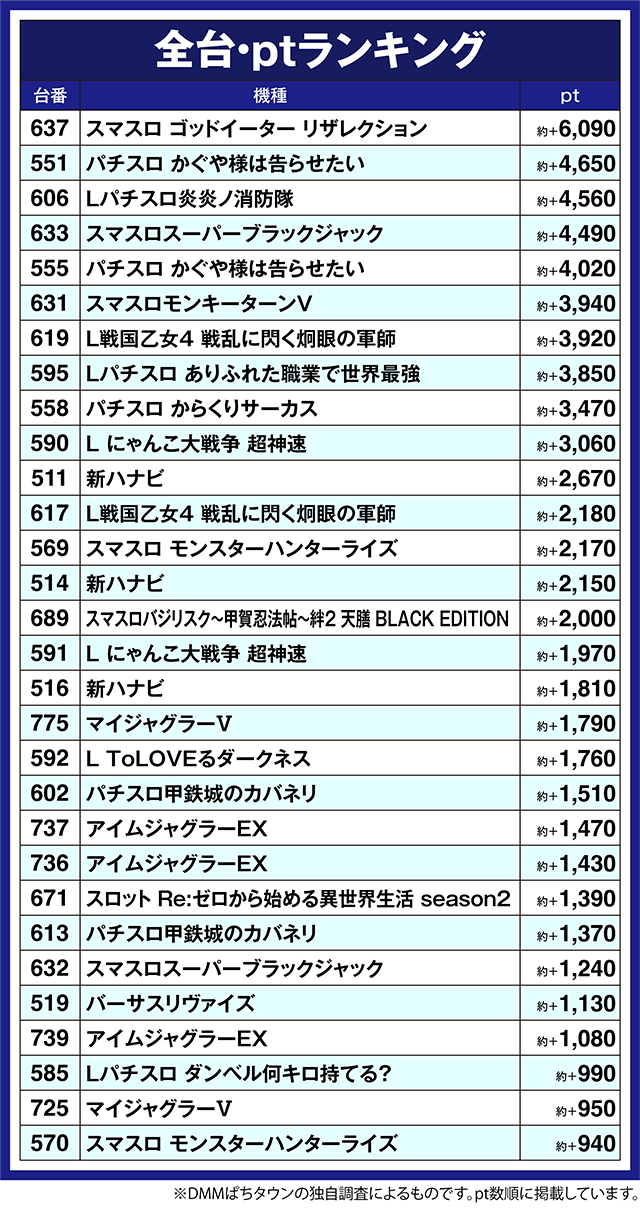 「パチスロ かぐや様は告らせたい」は2台が約+4,000ptを上回った。