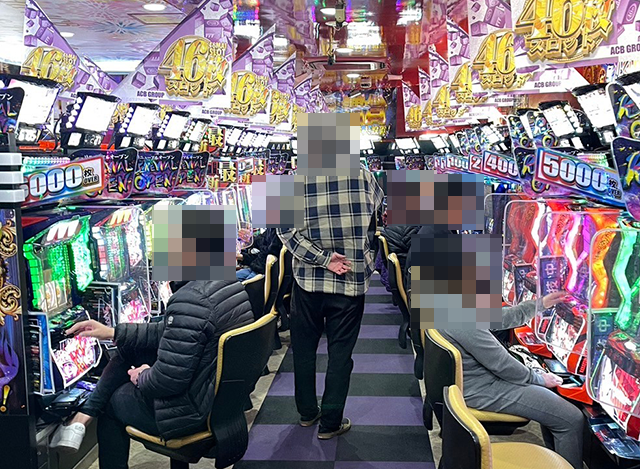 うれしそうに遊技をおこなっているプレイヤーが多かった「パーラーアシベ下田本店」。