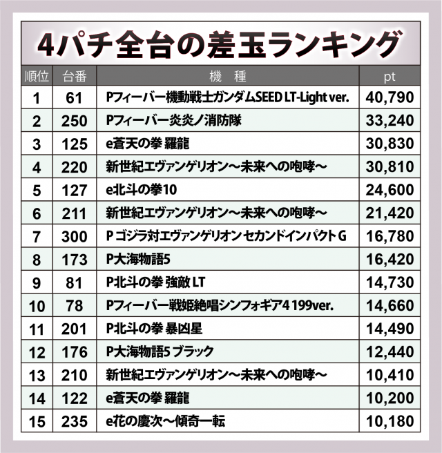 続いては4パチのベスト15台にスポットを当てる。