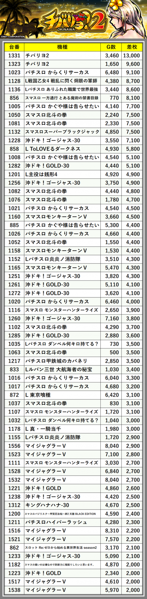 差枚数順に掲載しています