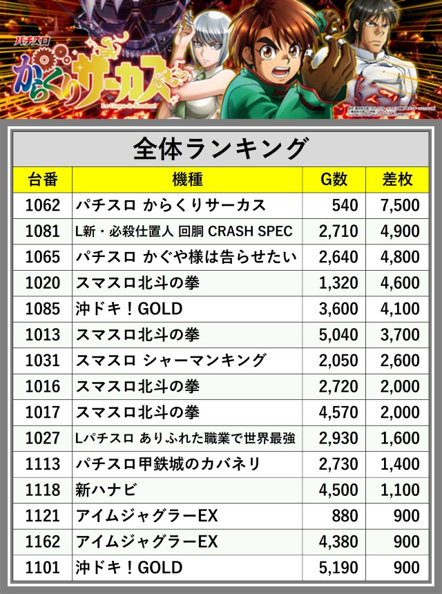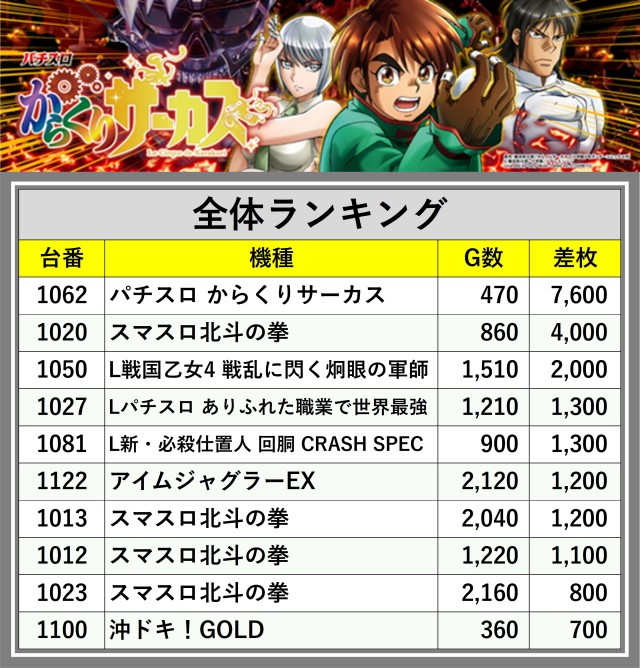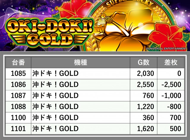 厳選された取材対象機種をはじめ、その他スロット全体から好記録が飛び出した!プレイヤーが楽しんだ1日を下記データにて振り返ってみて欲しい。