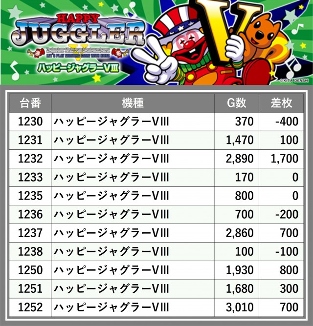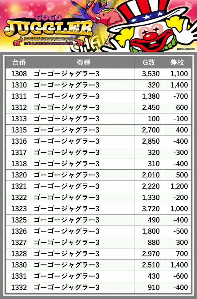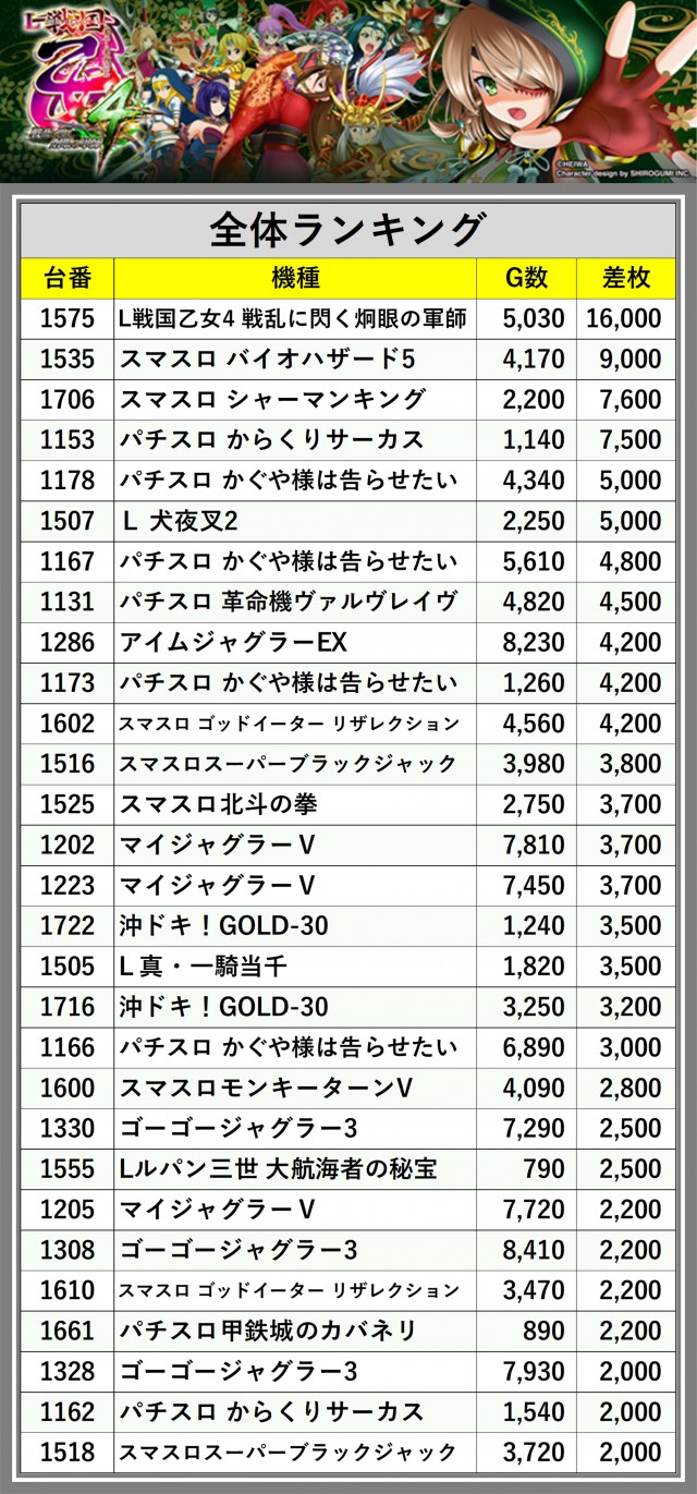 厳選された取材対象機種をはじめ、その他スロット全体から好記録が飛び出した!プレイヤーが楽しんだ1日を下記データにて振り返ってみて欲しい。