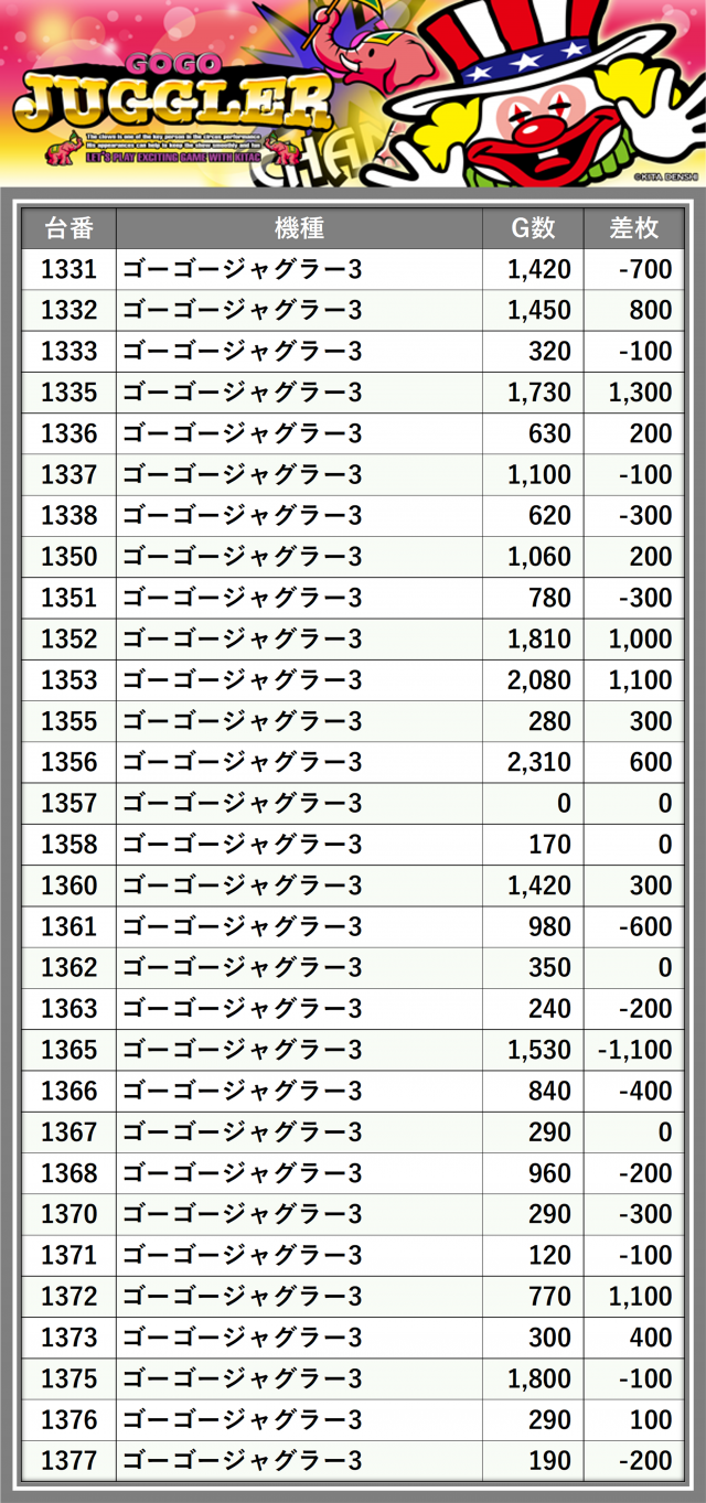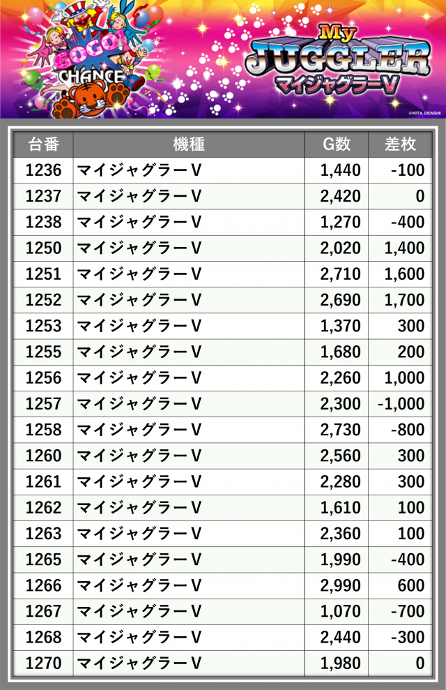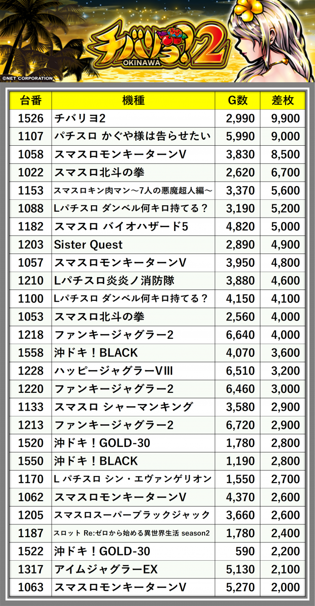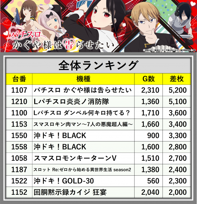 ※差枚数順に掲載しています