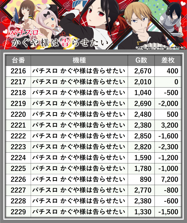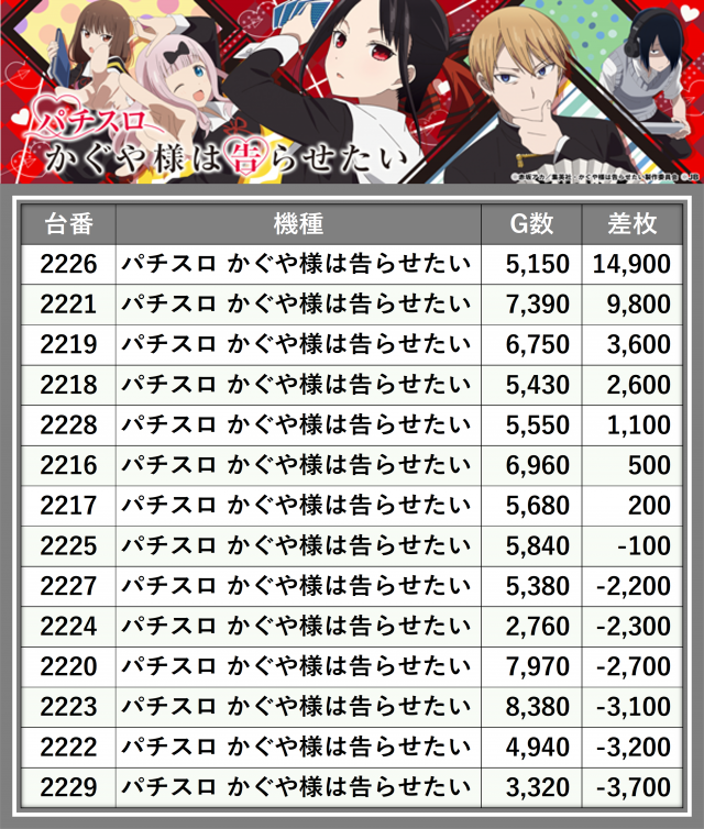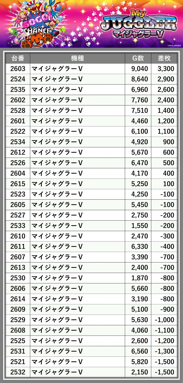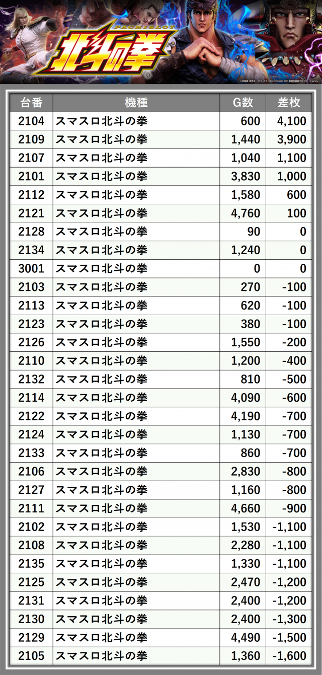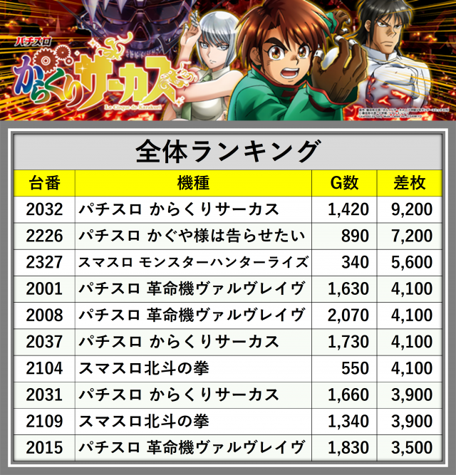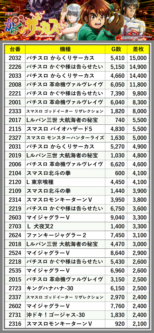 ※差枚数順に掲載しています
