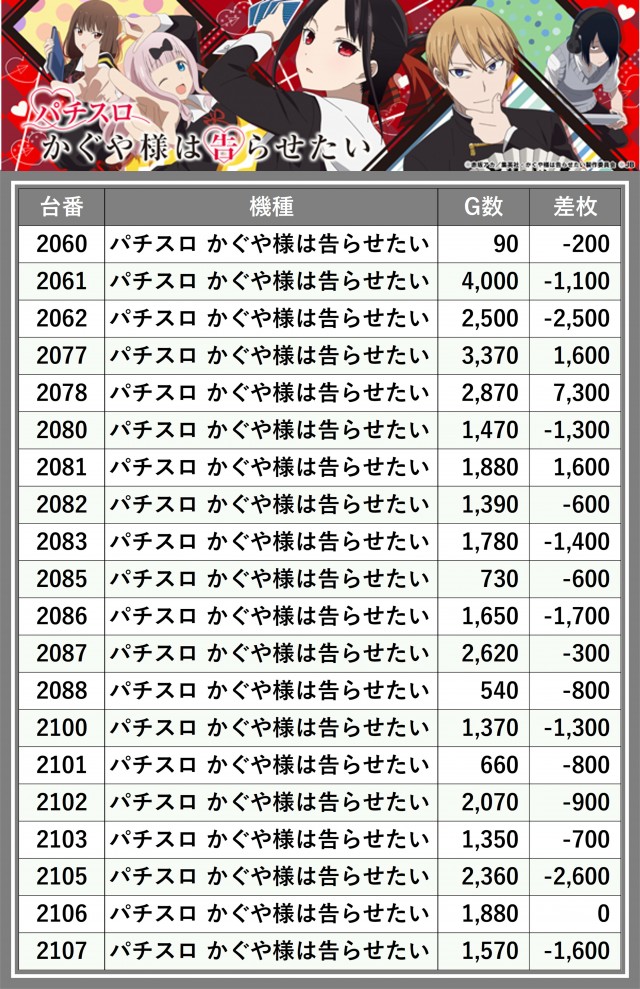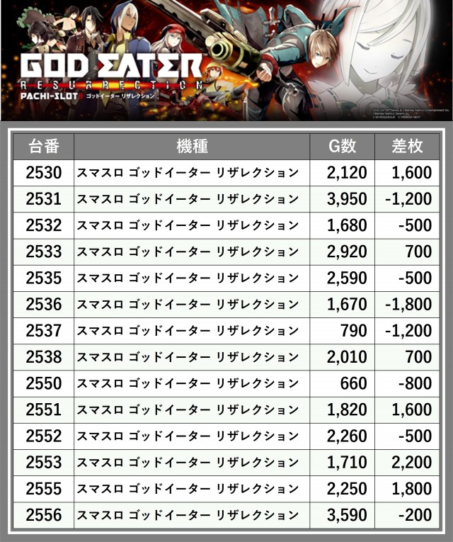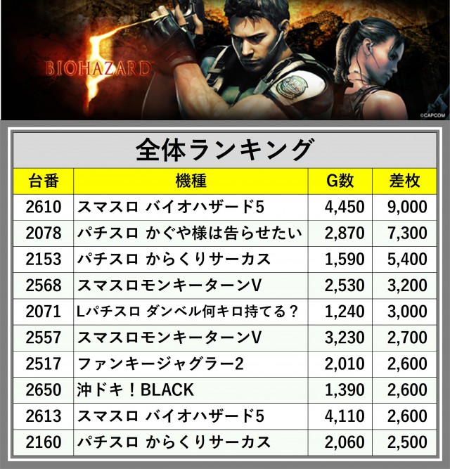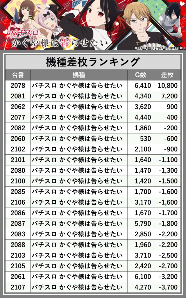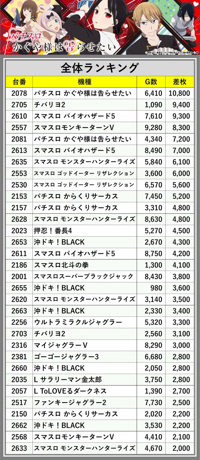 ※差枚数順に掲載しています