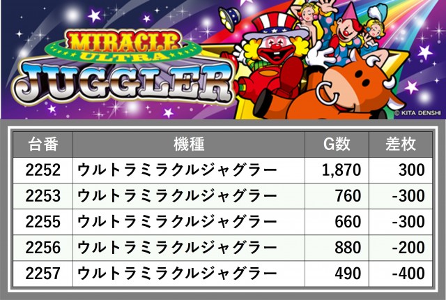 厳選された取材対象機種をはじめ、その他スロット全体から好記録が飛び出した!プレイヤーが楽しんだ1日を下記データにて振り返ってみて欲しい。