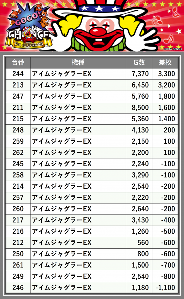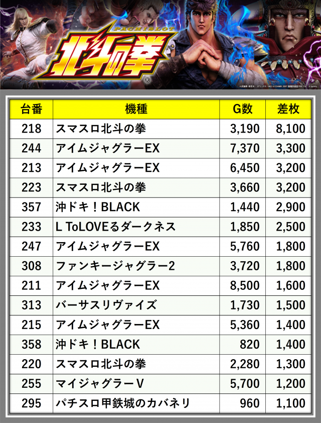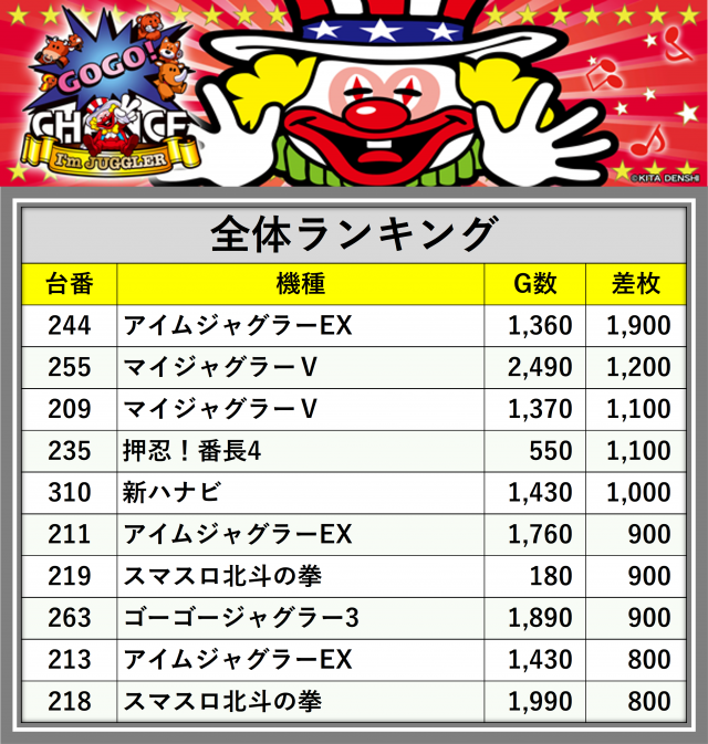 厳選された取材対象機種をはじめ、その他スロット全体から好記録が飛び出した!プレイヤーが楽しんだ1日を下記データにて振り返ってみて欲しい。