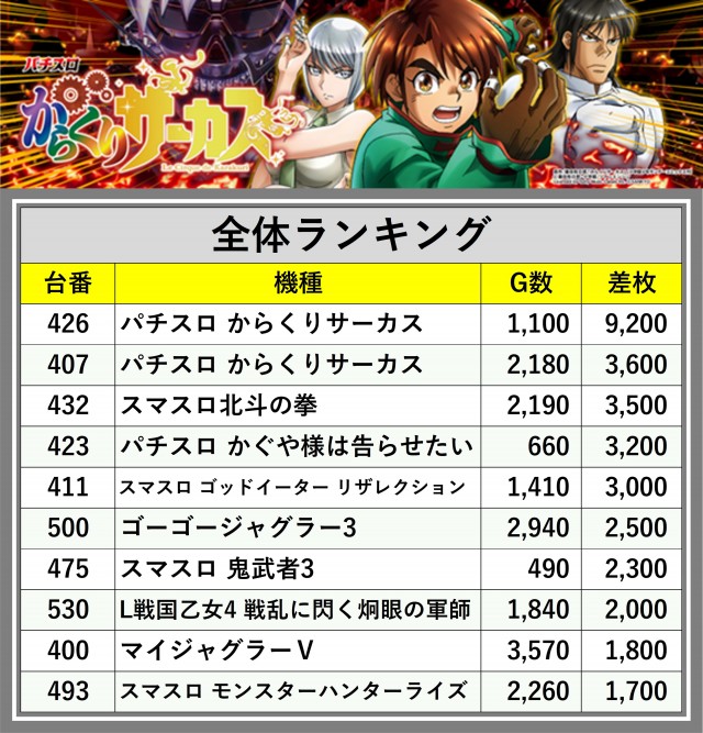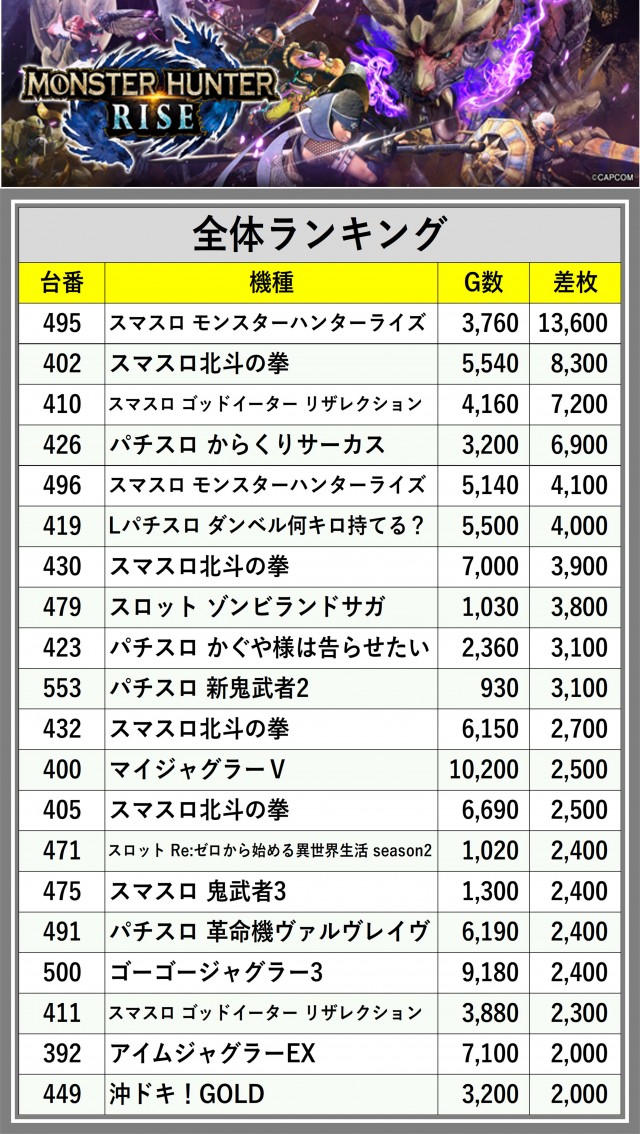 厳選された取材対象機種をはじめ、その他スロット全体から好記録が飛び出した!プレイヤーが楽しんだ1日を下記データにて振り返ってみて欲しい。
