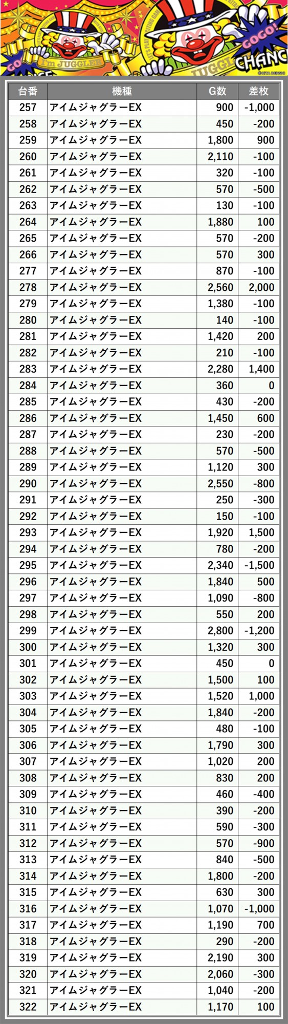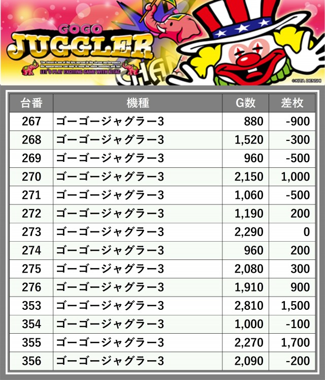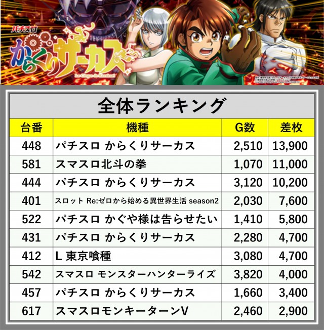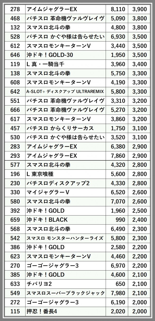厳選された取材対象機種をはじめ、その他スロット全体から好記録が飛び出した!プレイヤーが楽しんだ1日を下記データにて振り返ってみて欲しい。
