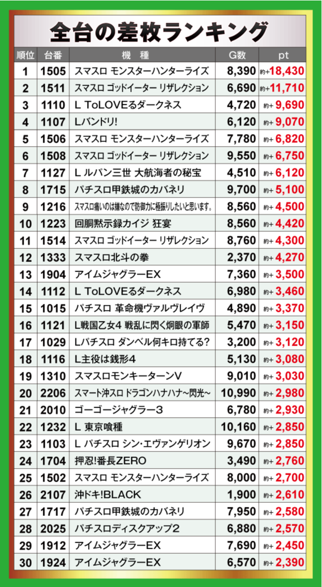 楽園沼津店からは怒涛の+18,000pt超が発生。しかも、これが全店舗通しての最高差枚となっているだけにプレイヤーは大満足の一日となったはずだ。