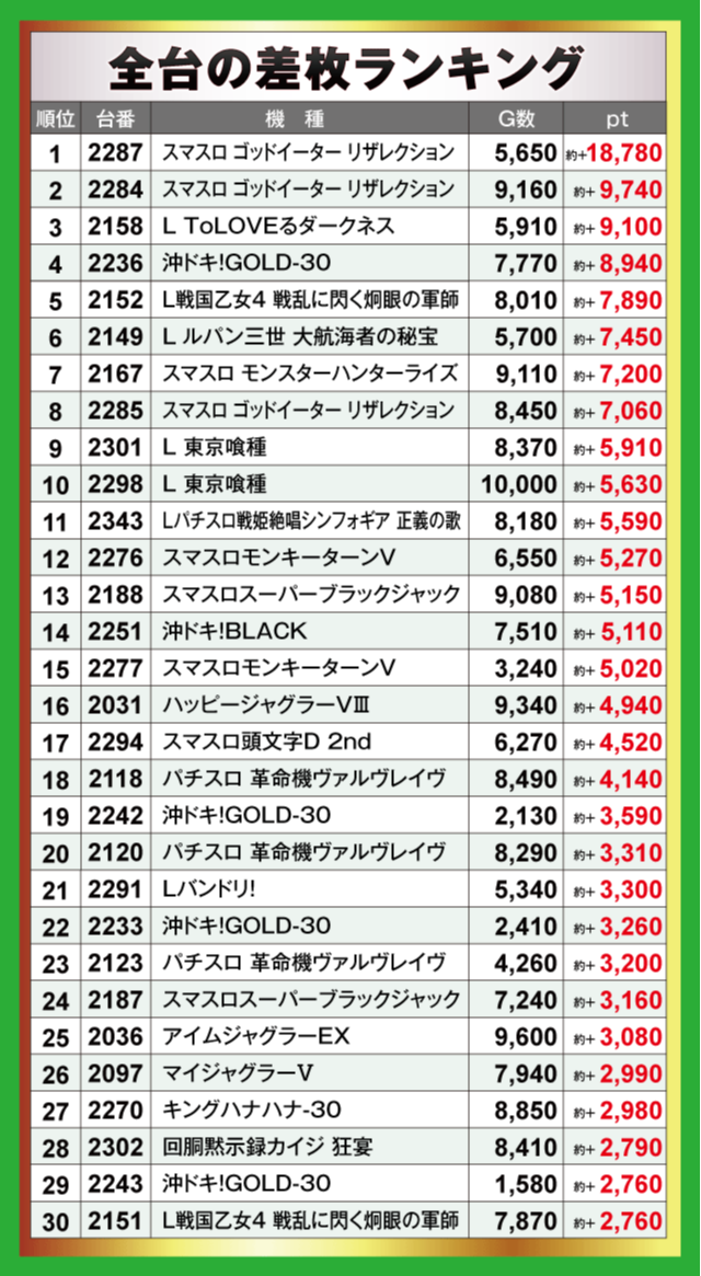 また、その他の機種では『L戦国乙女4 戦乱に閃く炯眼の軍師』から+7,000pt超、『L 東京喰種』から+5,000pt超が2台発生。定番の人気機種から比較的新しめの機種まで、人気のスマスロを中心に広範囲に渡ってチャンスが潜んでいたのは間違いないだろう。