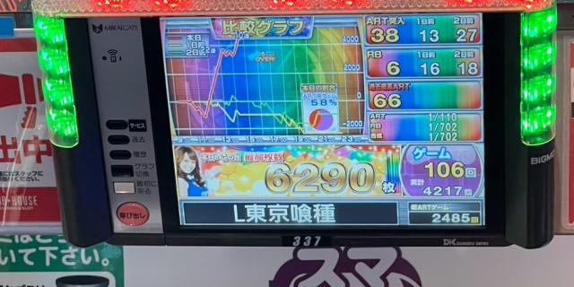 店内の様子をチェックすると、人気のスマスロを中心に多数の好調台を確認。そんな中、『L 東京喰種』と『パチスロ 革命機ヴァルヴレイヴ』が万枚超を達成しプレイヤーの注目を集めていた。次いで『スマスロモンキーターンV』が+7,580枚を記録、ランキングベスト3が実にハイレベルな結果を残している。