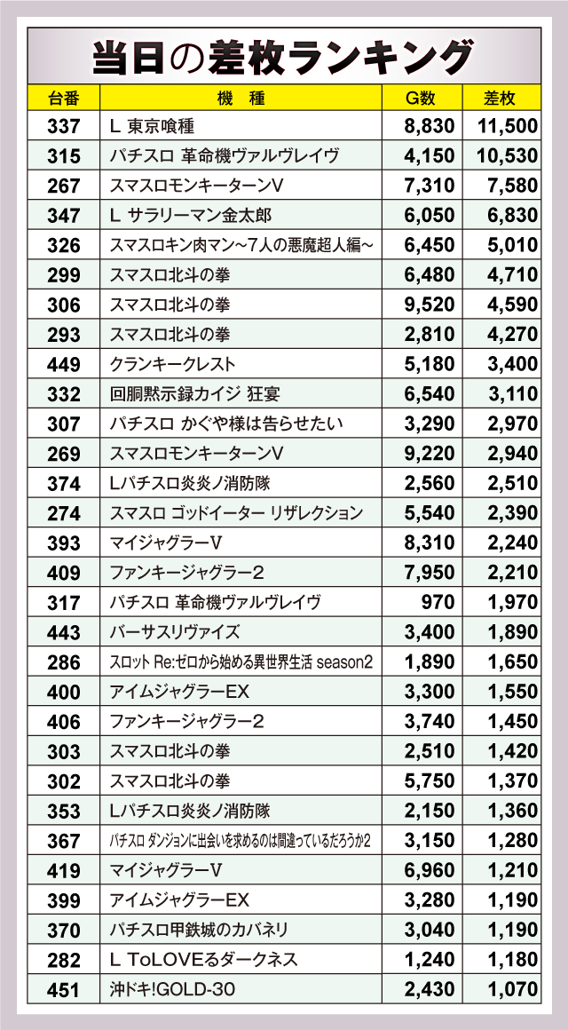 ※差枚数順に掲載しています。
