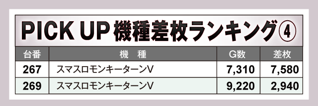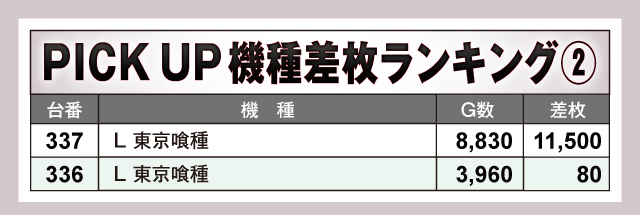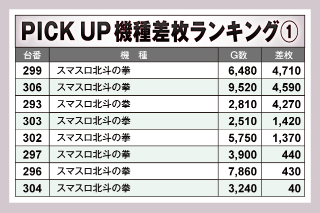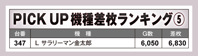 今回のPICK UP機種は全5機種。なかでも目立っていたのが『スマスロ北斗の拳』で、+4,000枚超が3台も発生しつつ半数以上の台がプラス差枚で終了している。また、『L サラリーマン金太郎』からも+6,830枚が確認されており、少台数機種にもしっかりとチャンスが潜んでいた点はファンにとって嬉しいポイントと言えるだろう。