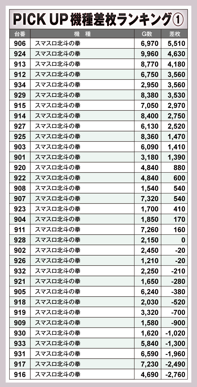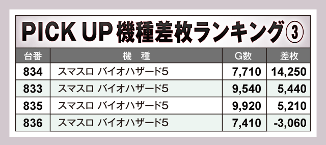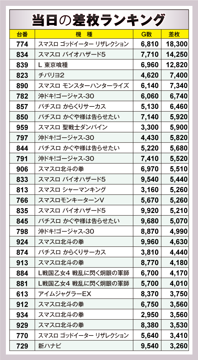この日は、『スマスロ ゴッドイーター リザレクション』が怒涛の+18,300枚を叩き出し堂々のランキングトップに輝いた。また、導入間もない新台『スマスロ バイオハザード5』も+14,250枚を記録。さらに『L 東京喰種』も万枚超を達成しており、ランキングベスト3が実にハイレベルな結果を残している。