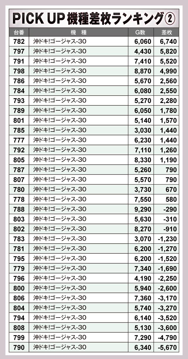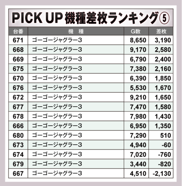 続いてPICK UP機種の状況をチェック!! 『スマスロ北斗の拳』は、+3,000枚超が6台、『沖ドキ!ゴージャス-30』は+5,000枚超が3台も発生している。そして、Aタイプながら『ゴーゴージャグラー3』も大奮闘。全15台中11台がプラス差枚となる見事な結果を残しているだけに、シマ内には常にファンの笑顔が溢れ返っていた。
