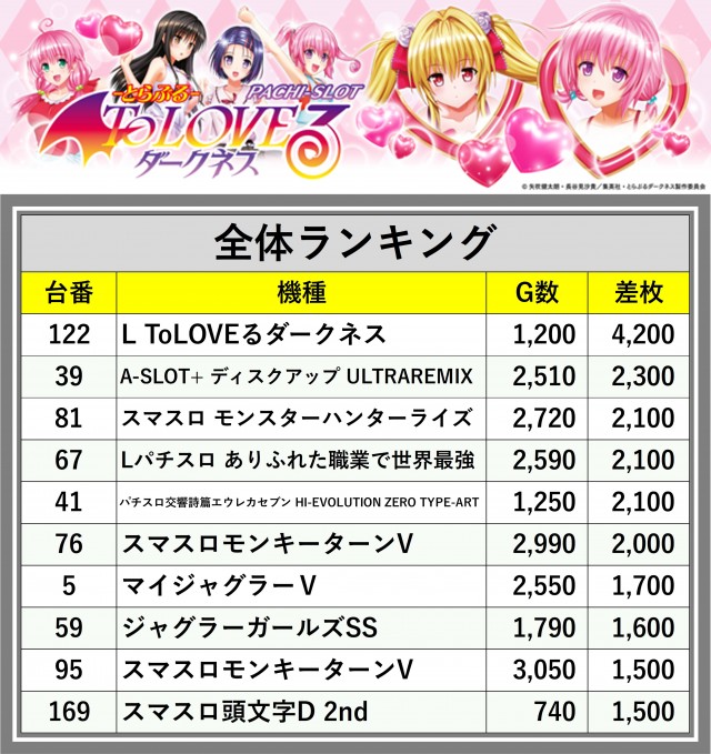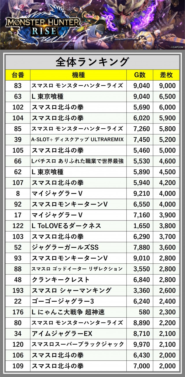 厳選された取材対象機種をはじめ、その他スロット全体から好記録が飛び出した!プレイヤーが楽しんだ1日を下記データにて振り返ってみて欲しい。