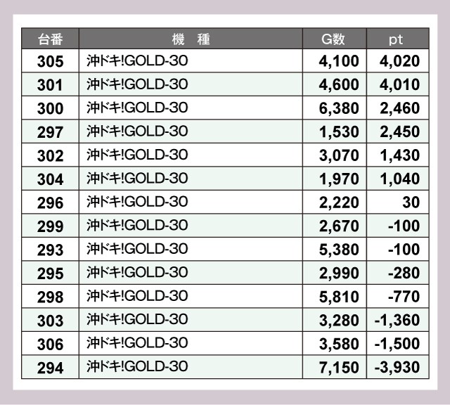 地域最大級の沖ドキコーナーでは『沖ドキ!GOLD-30』が大にぎわい。305番台+4,020ptをはじめ、4桁ptが続出する見事な記録を残している。